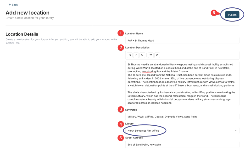 Keywords: Add relevant keywords that describe your location (e.g., “Castle, Fort, Park, Modern, Victorian”)
